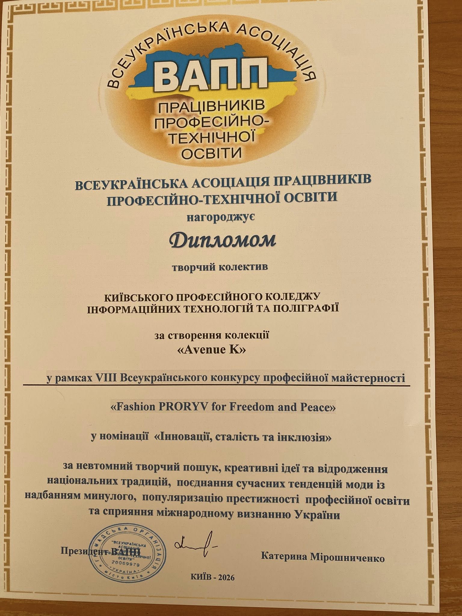 В колонній залі КМДА відбувся фінал Всеукраїнського конкурсу «Fashion PRORYV 2026”. Колекція спортивного адаптивного одягу «Аvenue K”: «Вулиця Каштанів»- присвячена нашому символу: київським каштанам; «Вулиця Києва» – нашій незламній столиці та киянам; «Вулиця Корчака»- наша адреса, авдентика кольорів закладу освіти. Вдячність авторам: Дмітрієвій О.М., Штипі С.М., Мартинович Т.О., Федоровій Л.Г. Колекція стала лауреатом та відзначена Всеукраїнською асоціацією працівників професійно- технічної освіти за невтомний творчий пошук, креативні ідеї та відродження національних традицій, поєднання сучасних тенденцій моди і надбання минулого, популяризацію престижності професійної освіти та сприяння міжнародному визнанню України.
